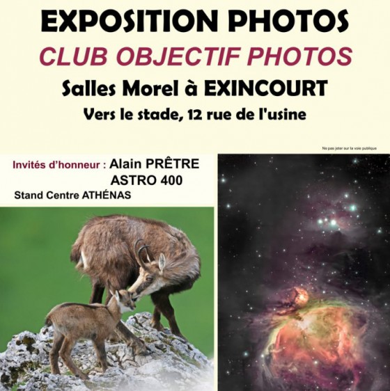 Venez en prendre plein les yeux, les 25 et 26 octobre de 10h à 18h, à la salle Morel d'Exincourt. Les invités d'honneur sont Alain Prêtre, photographe animalier, et Astro 400, association d'astronomie qui réalise des magnifique photos de l'univers.