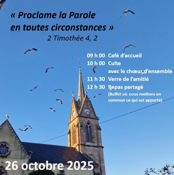 La journée festive est placée sous une parole biblique inspirante : « Proclame la Parole en toutes circonstances » (2 Timothée 4,2). C'est sous cet appel que nous nous réunirons pour ce temps de célébration commune.