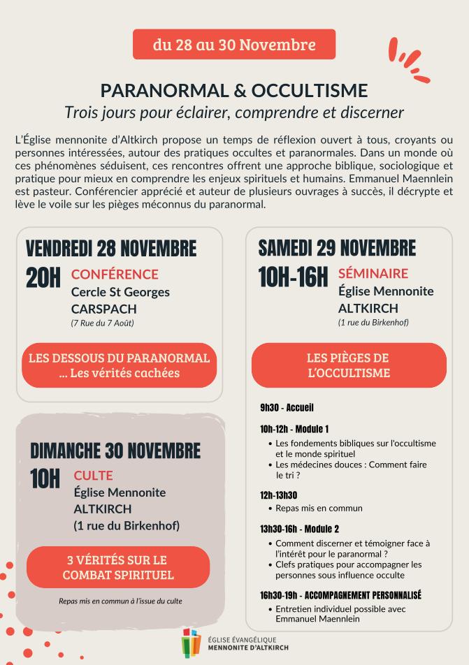 La journée du samedi est consacrée à un séminaire approfondi, intitulé « LES PIÈGES DE L’OCCULTISME », qui se déroulera à l’Église Mennonite ALTKIRCH (1 rue du Birkenhof).