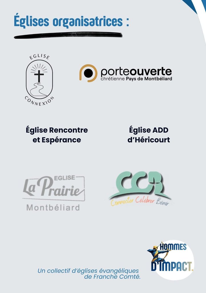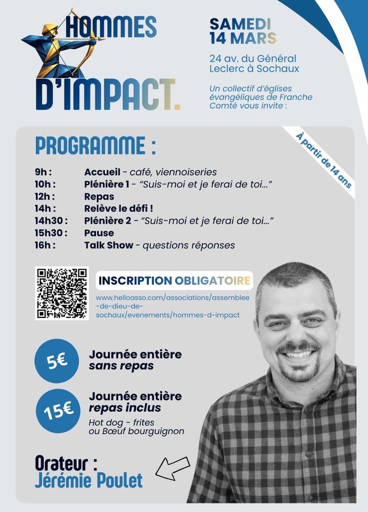 Les hommes du Pays de Montbéliard sont invités à participer à un événement exceptionnel intitulé "Hommes d'impact", qui se déroulera à Sochaux. Cette journée est spécialement conçue pour ceux qui désirent être encouragés, équipés et transformés en répondant à l'appel de Jésus : « Suis-moi et je ferai de toi... ».