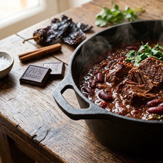 L'astuce du chef : Pour lier les saveurs et apporter une profondeur incomparable à la sauce, ajoutez deux ou trois morceaux de chocolat noir à 70 % en fin de cuisson. Vous obtiendrez alors un chili con carne riche, tendre et parfumé, prêt à être servi avec fierté.